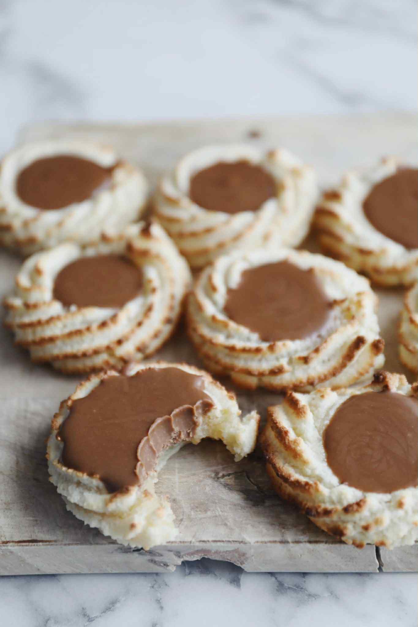 Kransekage med nougat – Opskrift på lækker kransekagekonfekt med nougat. Disse små nougat medaljoner er så nemme at lave og kræver kun marcipan, flormelis, æggehvide og nougat. Kransekagemassen laves ved at køre marcipan, flormelis og æggehvide sammen i en foodprocessor til en klistret masse. Massen komme si en sprøjtepose med en stjernetyl og sprøjtes ud på en bageplade med bagepapir. Der laves en fordybning med en våd ske i midten og kransekagemassen bages til den er gylden. Når de bagte kransekager er afkølet, smeltes nougat, som fyldes i fordybningerne. Herefter stilles de på køl til nougaten er størknet.