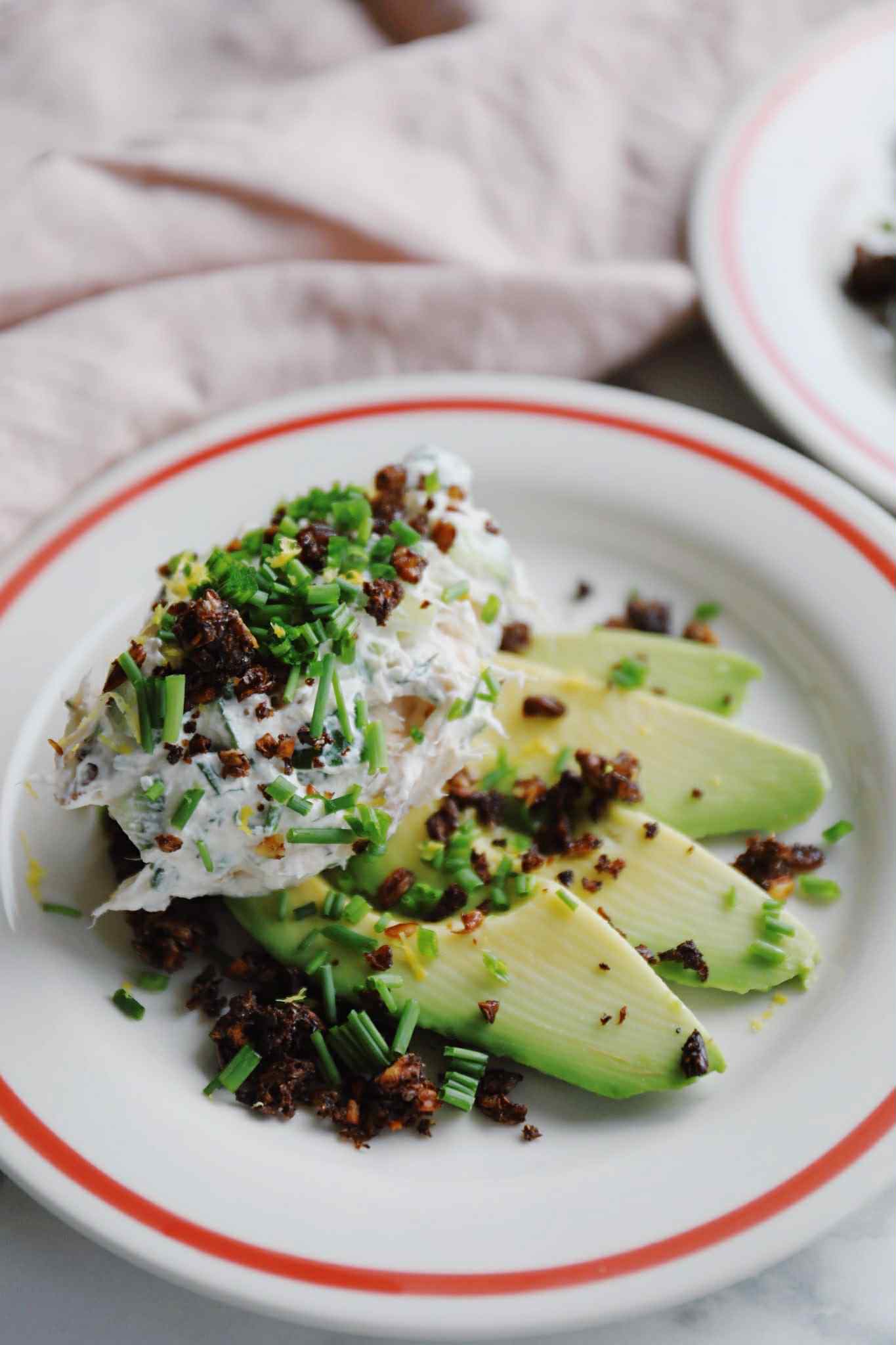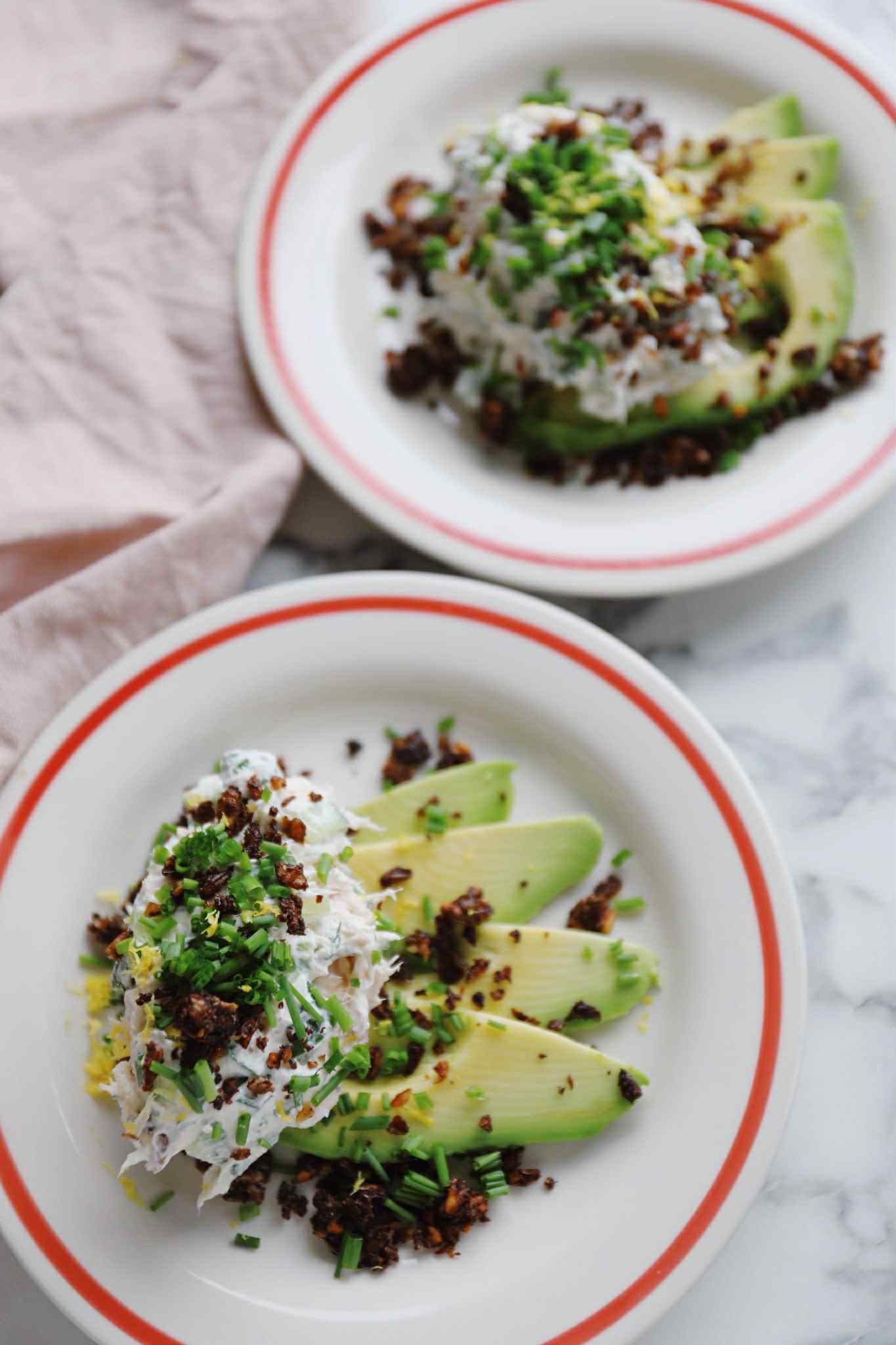 Laksesalat med rygeost – Opskrift på nem og lækker laksesalat med rygeost, varmrøget laks, agurk og purløg serveret på avocado med rugbrødscrunch. Denne lækre forret med laksesalat smager så skønt og er meget nem at lave. Laksesalaten laves med rygeost, som piskes med creme fraiche 38 %, salt, peber og citronsaft. Der tilsættes varmrøget laks, agurk, forårsløg, purløg og dild. Laksesalaten serveres på avocado i skiver og pyntes med sprød rugbrødscrunch, purløg og fintrevet citronskal.