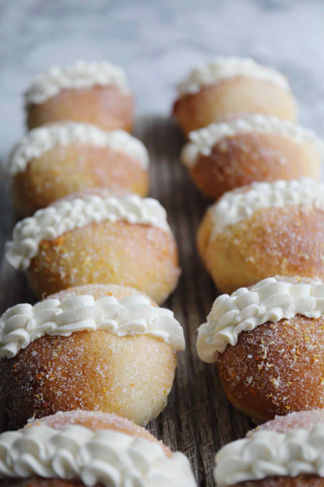 Denne dej laves med en fordej, hvilket giver en lækker dej og en lækker færdigbagt bolle. Når fordejen har hævet, så æltes den med æg, sukker, honning, citronskal, appelsinskal, olivenolie, hvedemel og salt. Der er måske lidt mange steps i denne opskrift, men de fleste af elementerne kan med fordel forberedes dagen inden. Bollerne skal dog helst “samles” lige inden servering, så de er helt friske og lækre. Prøv også min opskrift på fastelavnsboller med vaniljecreme eller min opskrift på fastelavnsboller med smag af æblekage. Rigtig god fornøjelse!