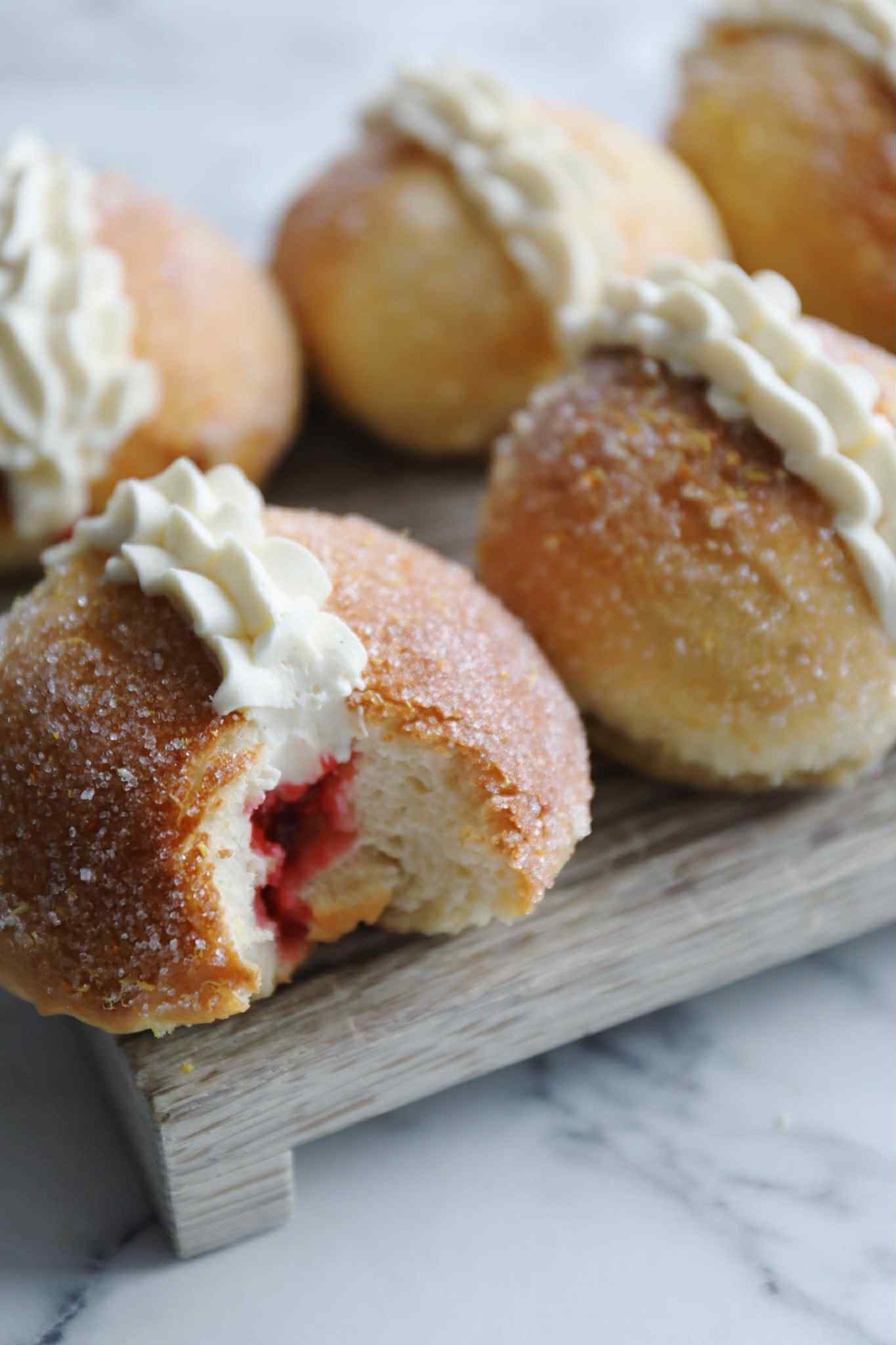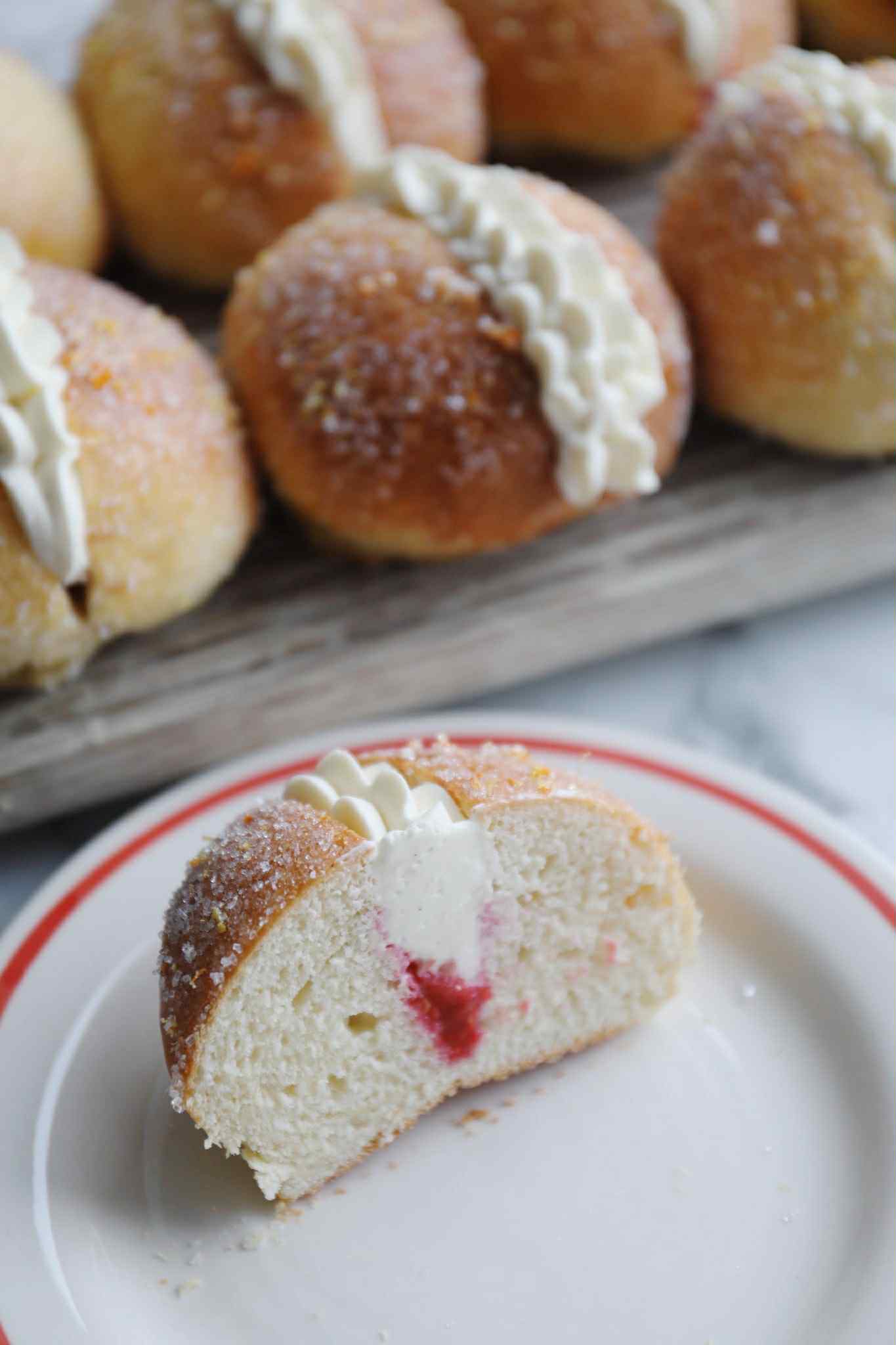 Maritozzi med citron og hindbær – Opskrift på lækre bløde italienske maritozzi boller med appelsin, citron, hindbærkompot og mascarponecreme. Maritozzi er en blød brioche agtigt bolle, med olivenolie i dejen i stedet for smør, som pensles med sirup efter bagning, skæres op og fyldes med flødeskum og drysses med flormelis. Her har jeg laves maritozzi bollen i en anderledes version og som en slags fastelavnsbolle. Når bollerne er bagt pensles de med citrussirup, rulles i citrussukker og fyldes med hindbærkompot og pisket mascarponecreme med hvid chokolade og vanilje.