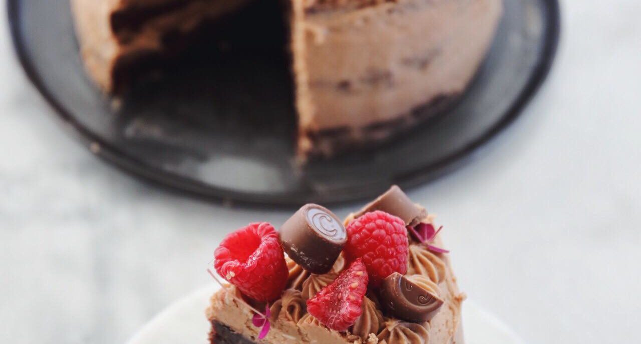 Placer en bund på det fad, du gerne vil servere kagen på og smør ¼ af chokoladesmørcremen ud på bunden. Sørg for at det kommer godt ud til kanterne. Når du har smurt det sidste creme ud på den sidste bund, kan du smøre kagen op med resten af cremen. Hvis der er mere creme tilbage kan du, ligesom jeg har gjort, sætte små dutter ovenpå kagen med en stjernetyl og pynte med hindbær, Toffifee, Center og skovsyre. Velbekomme!