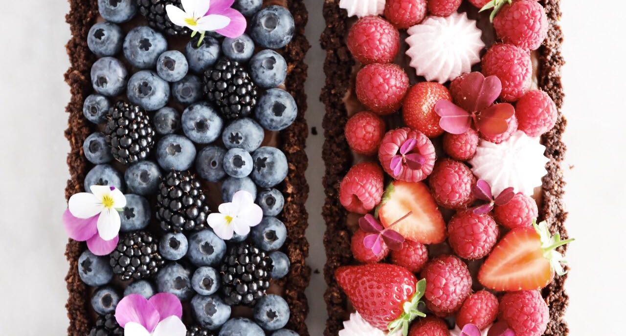 Lækker sprød kakao-kiksebund. Silkeblød mælkechokolade ganache. Friske søde og syrlige bær. Kan du forstille dig det? Den kombination er så himmelsk, at jeg var nødt til at kreere to af disse tærter og pynte dem med i hver sin smukke farveskala. Du kan helt selv vælge din egen farveskala. Her kommer opskriften:
