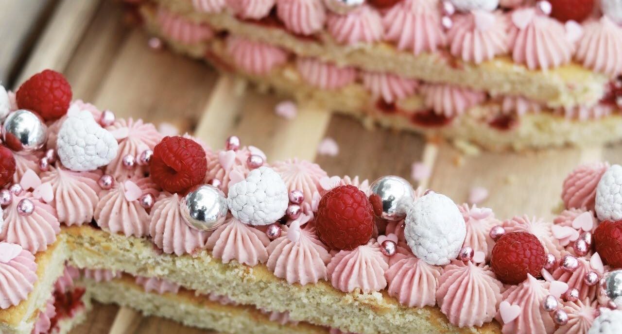 Pisk smør og sukker sammen. Tilsæt revet marcipan. Pisk ét æg i adgangen. Bland mel og bagepulver og sigt det i dejen. Pisk fløden i. Beklæd 2 bageplader med bagepapir og fordel dejen på bagepladerne. Fordel herefter hindbærrene i dejen og bage bundene i ovnen ved 175 C i ca. 20-25 minutter. Lad bundene køle af. Se videoen, hvordan jeg skære tallene ud.