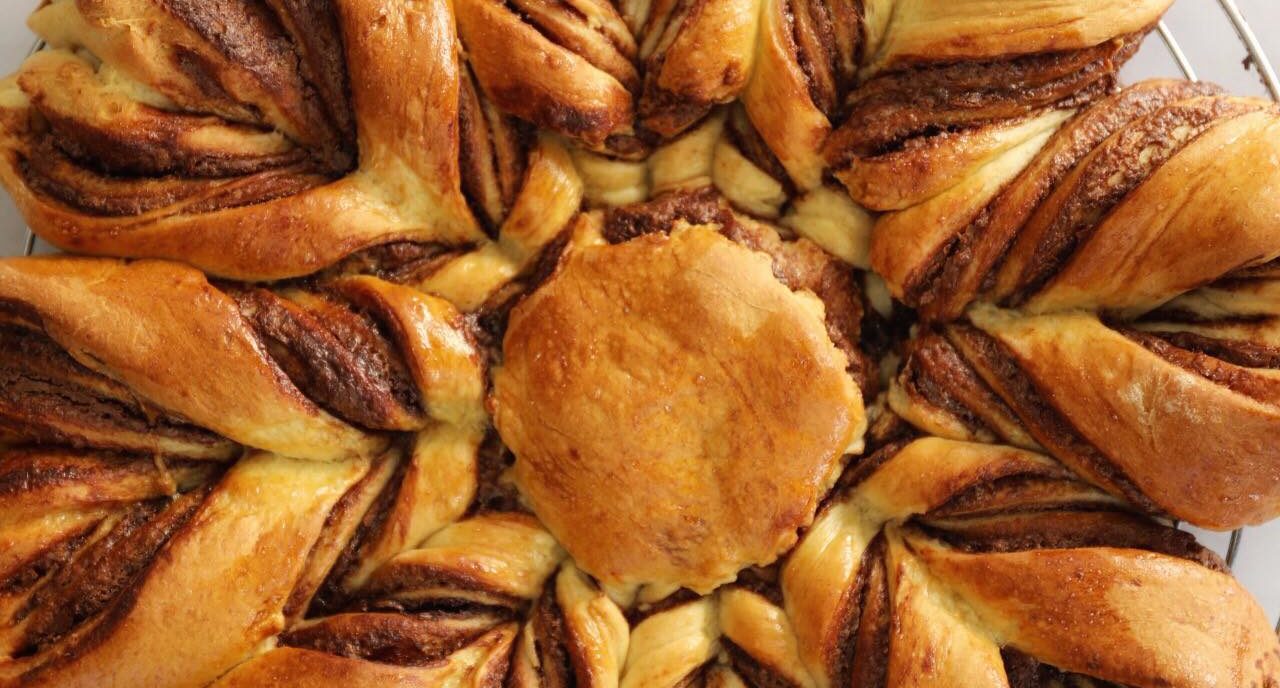 Når dejen har hævet deles den i 4 lige store stykker. Rul dejstykkerne ud i 4 ens runde plader (ligesom en pizzabund), på et bord drysset med lidt mel. Læg den første dejplade over på en bageplade med bagepapir og smør 1/3 del af nutellaen ud på dejen. Læg den næste dejplade over, smør nutella på, fortsæt indtil du har de 4 dejplader oven på hinanden – der skal ikke nutella på den øverste. Placér et glas i midten og tryk det lidt ned. Skær dejen fra glasset og ud, først i 4 dele, derefter skærer du de 4 stykker igennem en gang mere, så der i alt er 8 stykker. De 8 stykker skærer du også igennem og så er der 16. Nu er du klar til at dreje hvert dej stykke, drej dejen 2 gange. Til sidst sætter du dej-enderne sammen to og to, så der dannes i alt 8 spidser i stjernen. Lad stjernen efterhæve i 20 minutter. Pensl stjernen med et pisket æg og bag den i ovnen i ca. 20 minutter ved 200 grader. Server stjernen imens den stadig er lun. Velbekomme!