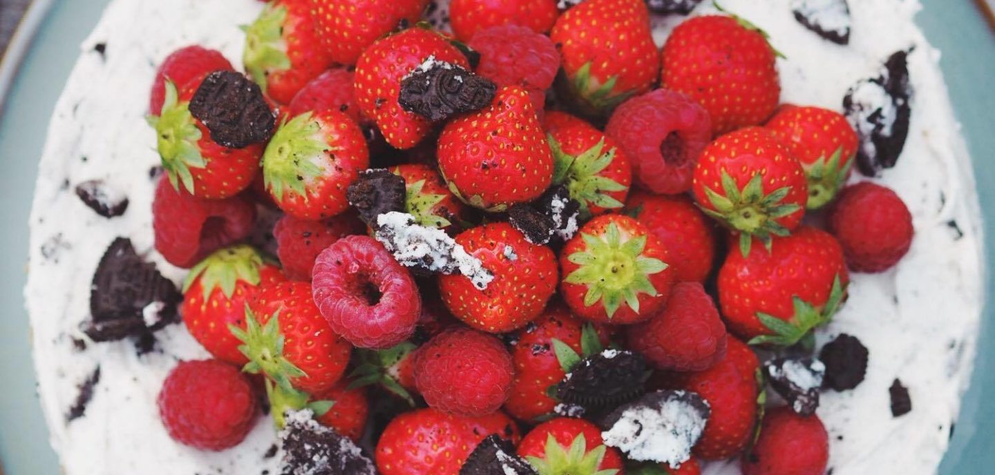 Befri kagen fra springformen og kageplast. Pynt kagen med friske hindbær og jordbær samt knuste Oreos. Velbekomme!