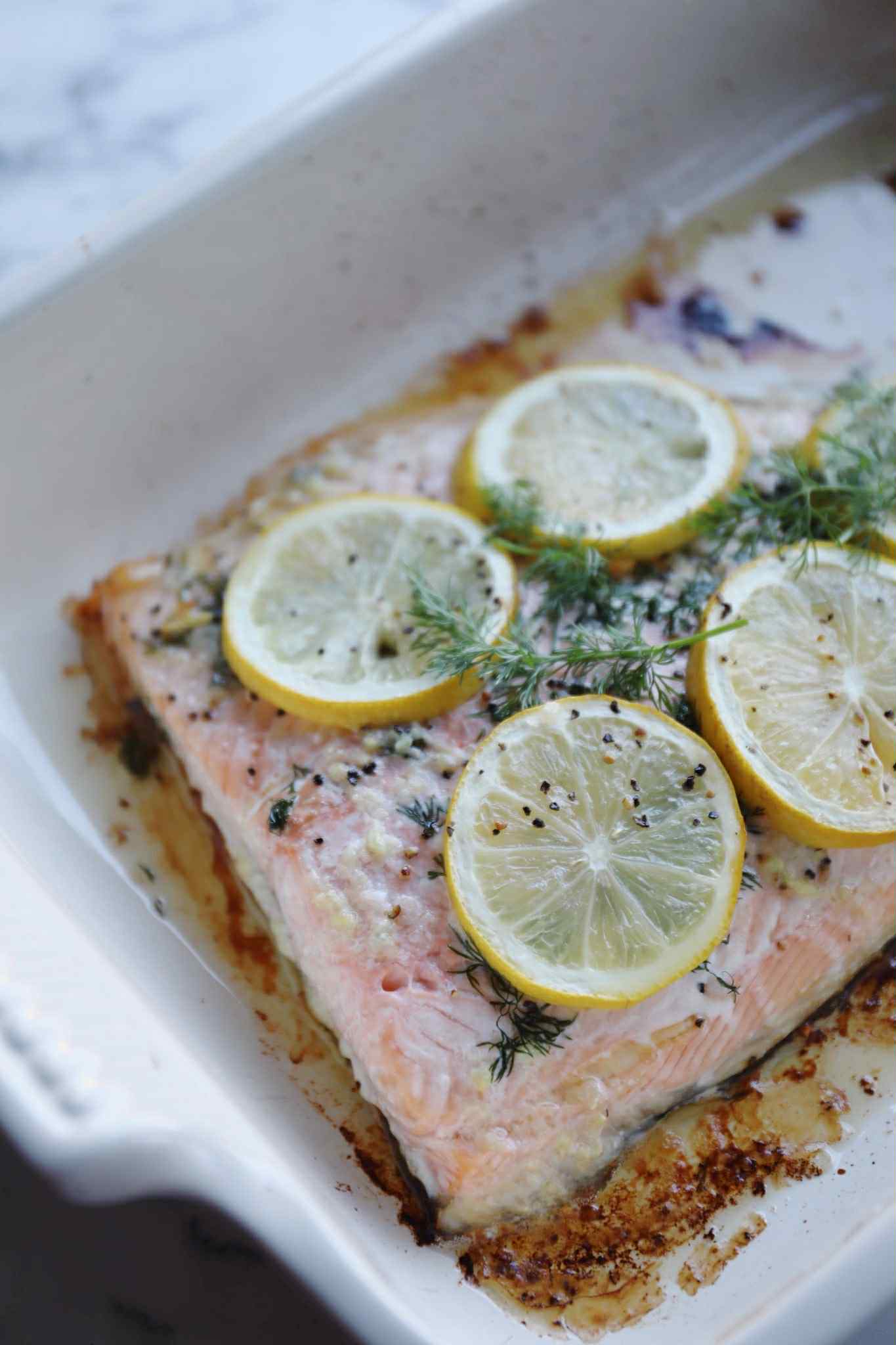 Fersk laks bagt i ovnen er nok en af mine livretter, det smager bare så dejligt og laksen bliver så lækker og saftig. Når laksen, som i denne opskrift, bages med både citron og hvidløgssmør, så giver det en skøn smag til laksen. Den ovnbagte laks kan både serveres varm og kold. Her har jeg brugt et helt stykke lakseside, men man kan også bruge laks der er skåret ud i “bøffer” i stedet for et stort stykke. Laksen kan serveres til f.eks. disse stegte kartofler med hvidløg og med denne friske salat med jordbær, pinjekerner og feta. Og så smager sådan et stykke laks også virkelig lækkert til forret anrettet på salat og med en creme fraiche dressing til. Rigtig god fornøjelse!
