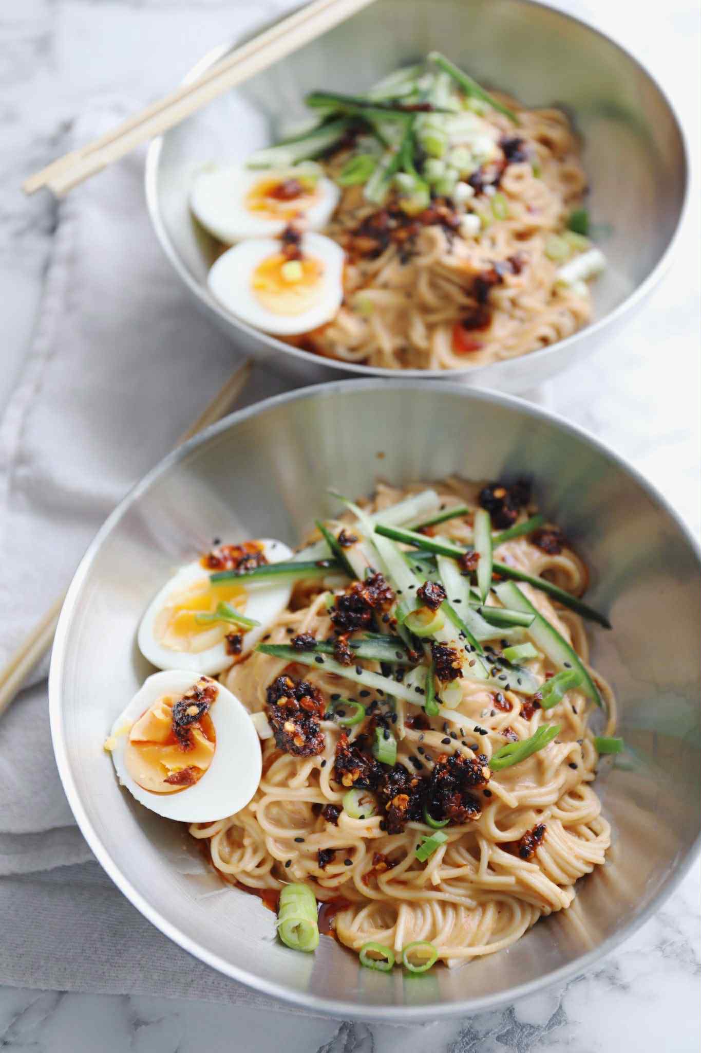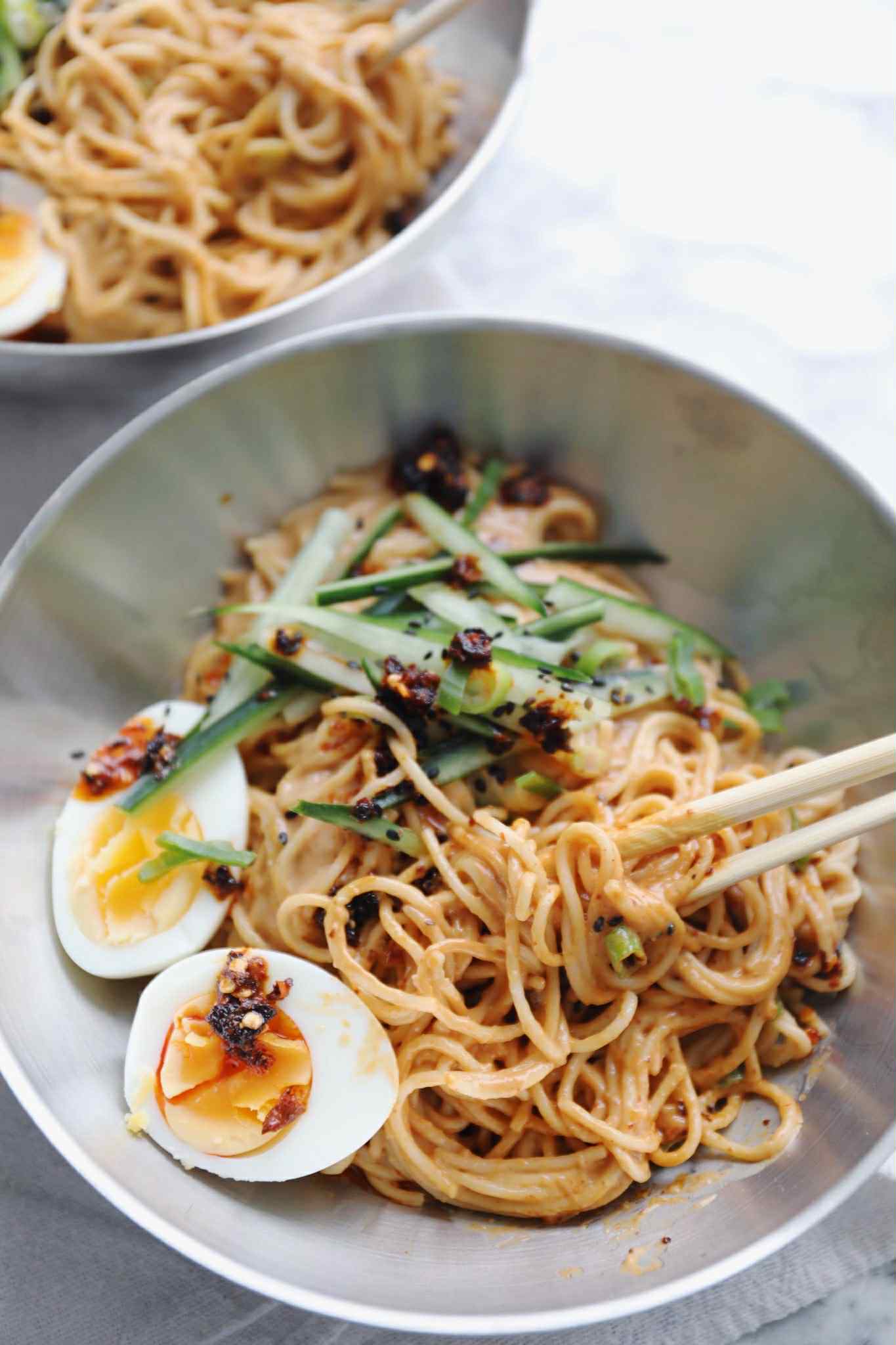 Anret nudlerne med peanutbutter sauce med æg, agurker i tynde stave, crispy chiliolie og sesamfrø. Server straks. Velbekomme!