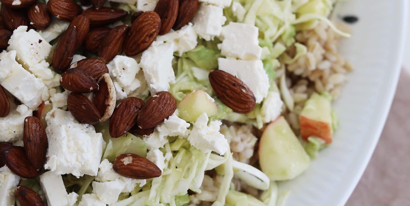 En skøn perlebygsalat med æble og spidskål. Denne salat er et frisk og lækkert indslag til en julefrokost, påskefrokost, til grillmad eller en perfekt frokostsalat. Jeg havde denne salat med til en julefrokost i går og den blev taget rigtig godt imod. Salaten består af perlebyg, og så er der spidskål, æbler og avocado som er vendt i en syrlig dressing med citron, sennep, honning og olivenolie. Salaten er toppet med feta og ristede mandler. Salaten kan serveres med godt hjemmebagt brød til og f.eks. sprøde kyllingestykker. Rigtig god fornøjelse!