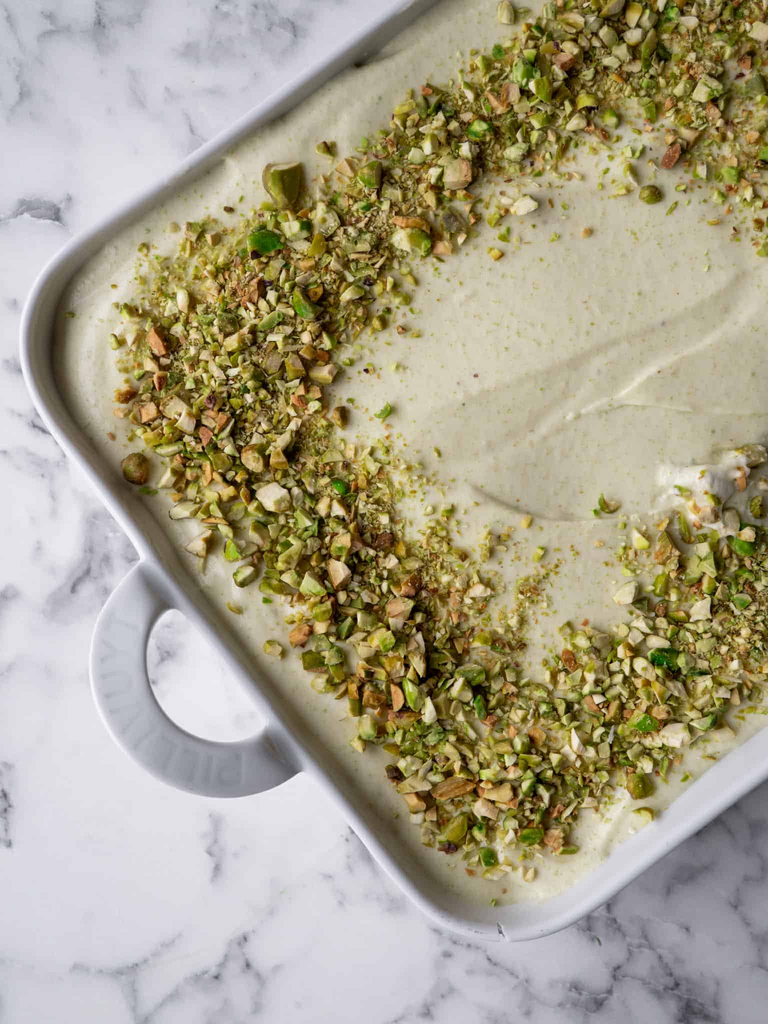 Stil fadet i køleskabet i minimum 6 timer, men allerhelst til dagen efter. Drys med de resterende pistacienødder inden servering. Velbekomme!