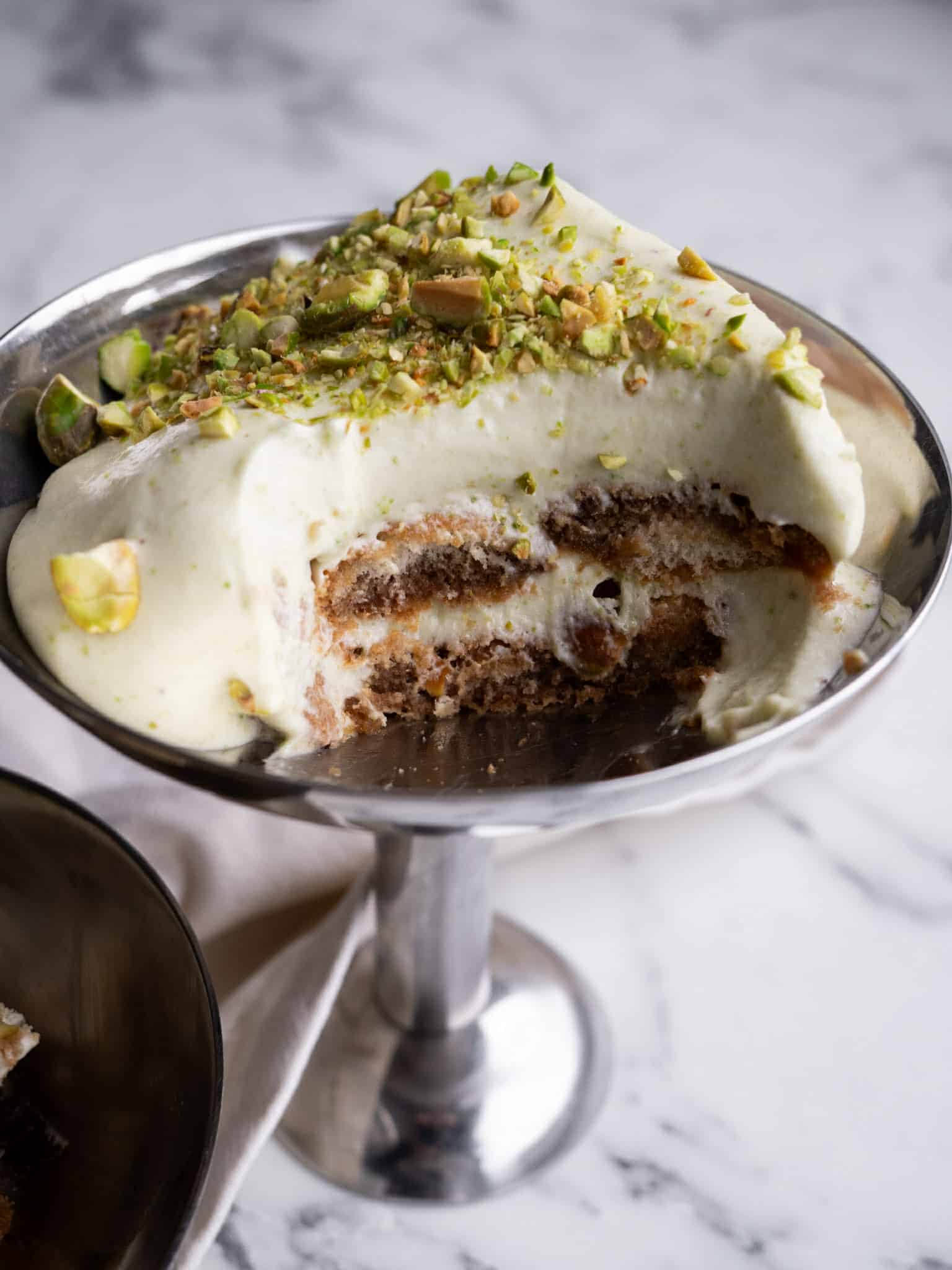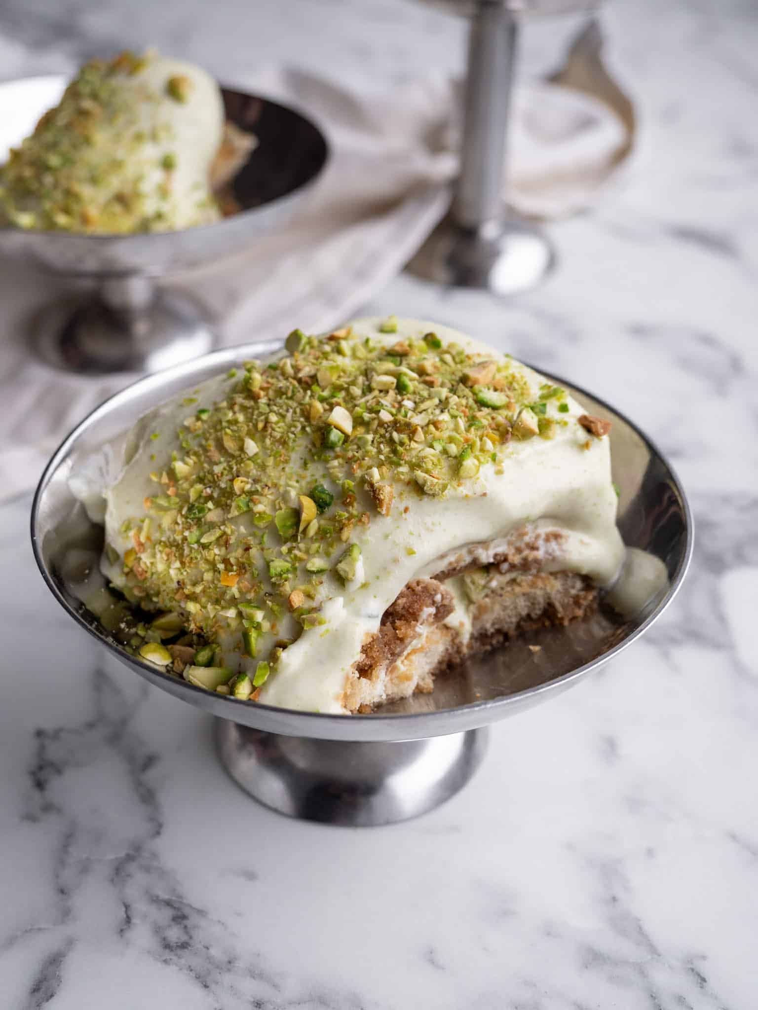 Tiramisu er en ideel dessert at servere som det søde punktum efter en middag, da det er en dessert, der nemt kan laves og samles dagen inden servering. Faktisk har tiramisu allerbedst af at stå på køl til dagen efter, så ladyfingers kan trække god smag og cremen blive endnu mere luftig. Hvis man vil lave tiramisuen uden alkohol, så kan man sagtens undlade at tilsætte rom i den stærke kaffe. Pistacie tiramisu er perfekt at servere til påskefrokosten eller som desserten til nytårsaften.