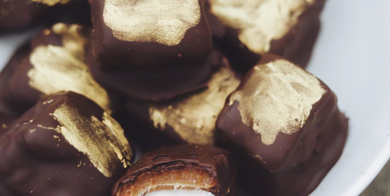 Skumfiduser med karamel og mørk chokolade