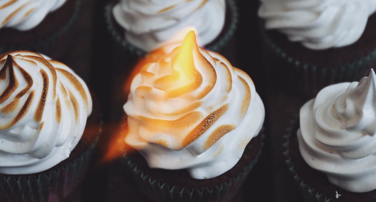Pisk æggehviderne stive. Tilsæt flormelis lidt ad gangen, imens der fortsat piskes. Tilsæt vanilje. Pisk indtil det bliver til en sej marengs – det tager ca. 10 minutter. Kom marengsen op i en sprøjte pose med en stjernetyl. Sprøjt marengs ud på hver cupcake og brænd marengsen med en bunsenbrænder. Server helst kagerne med det samme, så smager det bedst. Velbekomme!