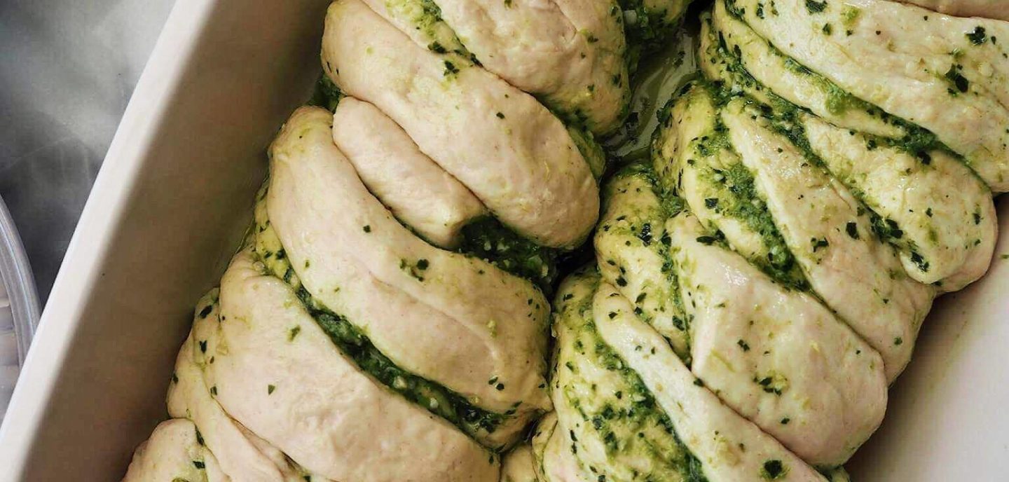Når dejen er hævet, drysses lidt mel ud på bordet, og dejen rulles ud i en rektangel. Fordel pestoen på dejen, og sørg for at smøre det helt ud til kanterne. Fold dejen sammen én gang, sådan at pestoen er danner et lag i midten af dejpladen. Skær dejen over på midten, sådan at du har to mindre rektangler. Skær igen dejen over på midten, men skær den ikke helt igennem, de to dejstykker skal sidde samme. Sno derefter de to dejstykker sammen ved at skiftevis at lægge den ene over den anden. Form den snoede dej til et brød. Smør en bageform eller et fint ovnfast fad, her er brugt et ovnfast fad på ca. 27 x 18 cm. Læg brødet i fadet, og sno det andet brød, og læg det ved siden af. Lad brødene hæve i ca. 1 time og pensl dem med et sammenpisket æg. Bag brødene i ovnen ved 200°C i ca. 30 minutter, til de er fint lysebrune og lyder hule, når du banker på dem. Servér brødene lune. De kan serveres hele, da pestoen gør, at de er nemme at hive fra hinanden ved bordet.