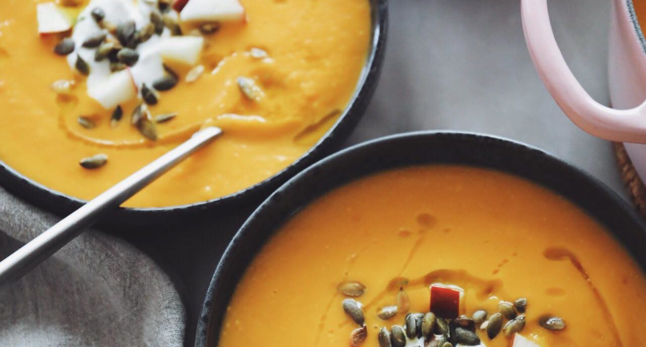 Suppesøndag byder i dag på en skøn og cremet græskarsuppe med lækre toppings. Det er jo perfekt suppevejr i dag! Suppen er virkelig nem at lave og egner sig godt til at lave i en større portion, så du har hurtig mad igen dagen efter. Jeg har her serveret suppen med creme fraiche, friske æbler skåret i tern, græskarkerner og limeolie. Prøv også med sprødt stegt bacon eller kikærter ristet i ovnen. Server et dejligt brød til suppen f.eks. foccacia brød, sprødt og luftigt brød, snegle med ost og oliven eller snoet pestobrød. Jeg har tilsat piskefløde for at få suppen cremet, men det smager også skønt med kokosmælk i. Prøv også denne kartoffel-porre-suppe. Rigtig god fornøjelse!