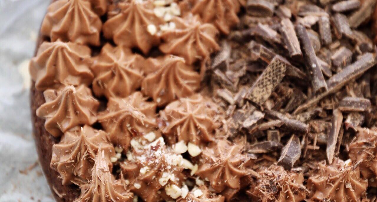 Pynt kagen, som jeg har gjort, med “dutter” af nutella frosting, hakket mørk chokolade og hakkede hasselnødder eller pynt den kun med nutella frosting. Stil kagen på køl, så den er kold, når den skal serveres. Velbekomme!