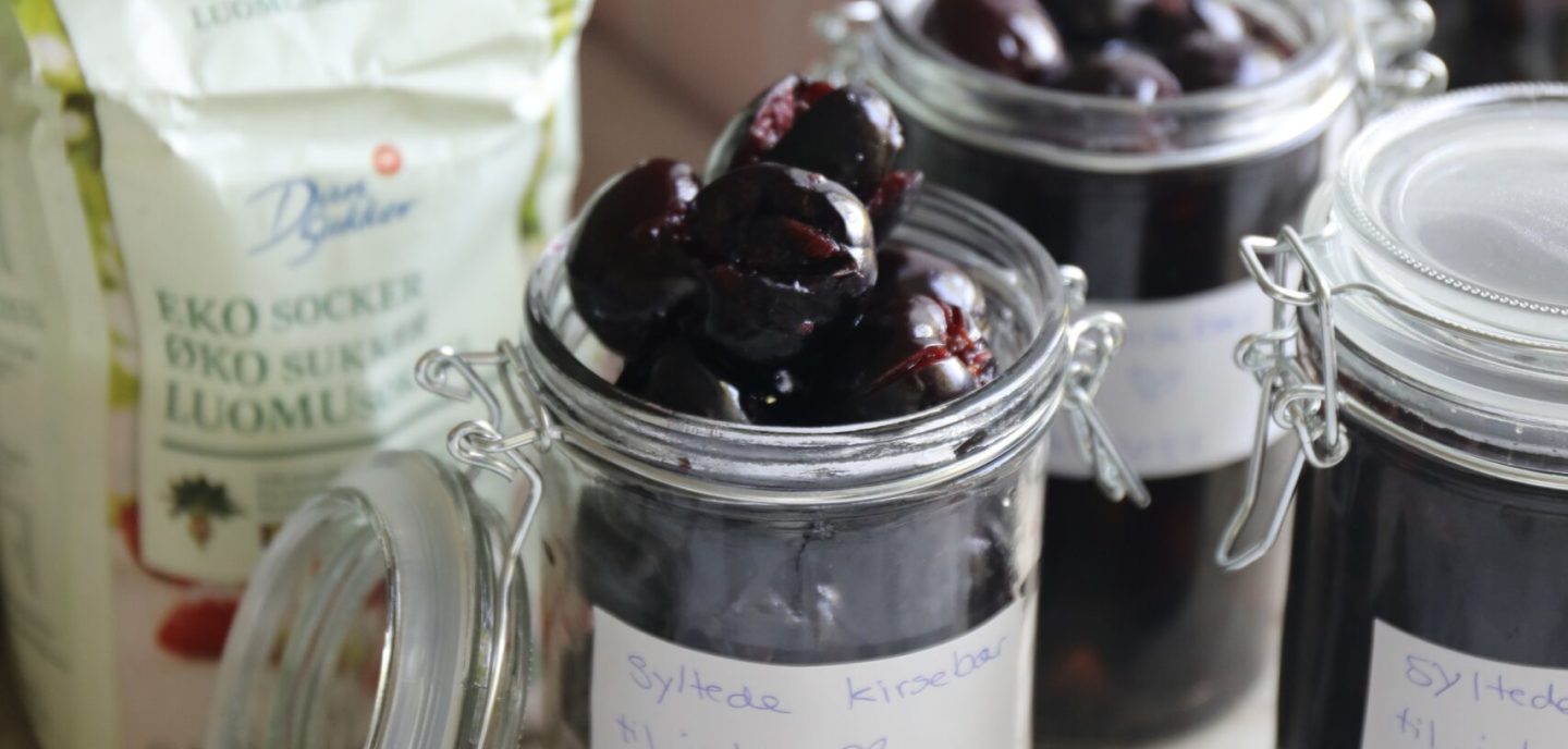 Syltede kirsebær – Opskrift på syltede kirsebær, som er perfekte til hjemmelavet kirsebærsauce til risalamanden til jul. Det er meget nemt at sylte kirsebær selv, og det kræver kun ganske få ingredienser for at få lækre friske kirsebær forvandlet til de dejligste syltede kirsebær. Er du heldig at have kirsebær i haven eller bo i nærheden af en kirsebærplantage med selvpluk, er det en skøn måde at gemme sommer til vinter ved at sylte de sommermodne bær til senere brug. Hvis du ikke selv kan plukke kirsebærrene, er det også helt fint at købe et kilo af de lækreste friske (danske) kirsebær ved din grønthandler. Jeg bruger økologisk og danskproduceret sukker fra DanSukker til at sylte de friske bær.
