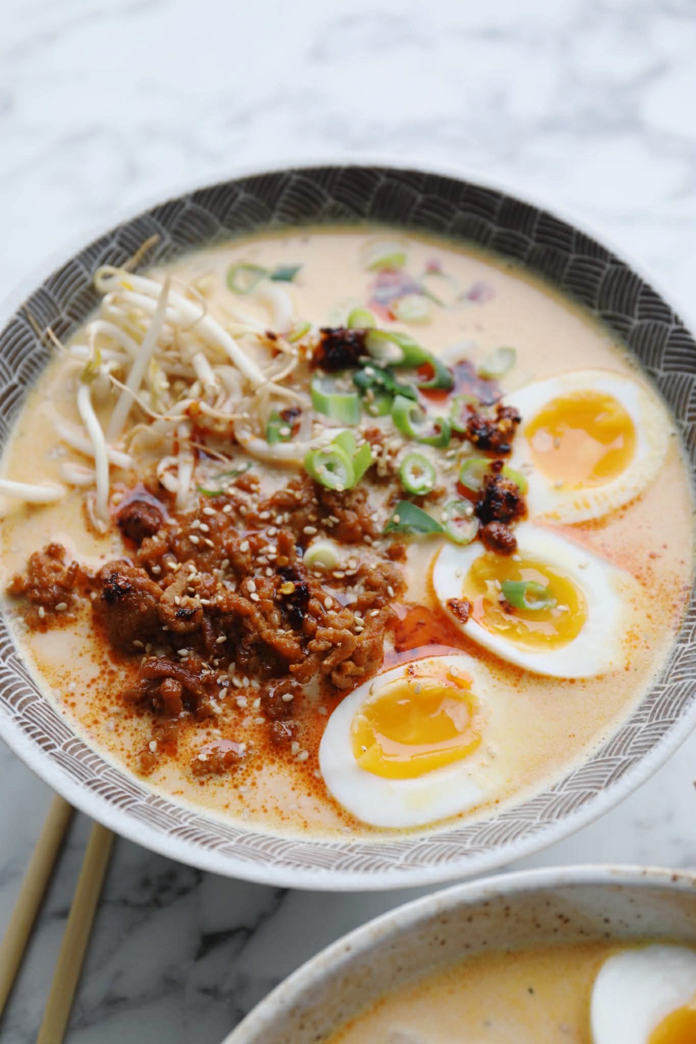 Der er mange måder at lave tan tan ramen på og sådan her kan jeg bedst lide selv at lave den. Suppen laver jeg med hønsebouillon og kokosmælk, som også kan være usødet havremælk. Til suppe pasten bruger jeg bl.a. tahin, gochujang, peanutbutter og soya. Kødet steger jeg med soya, hvidløg, ingefær, gochujang og brun farin. Når suppen er klar serveres den med udon nudler, det stegte kød, halverede smilende æg, bønnespirer, forårsløg, sesamfrø og crispy chiliolie. Man kan også servere suppen med pak choi eller soyamarinerede æg.