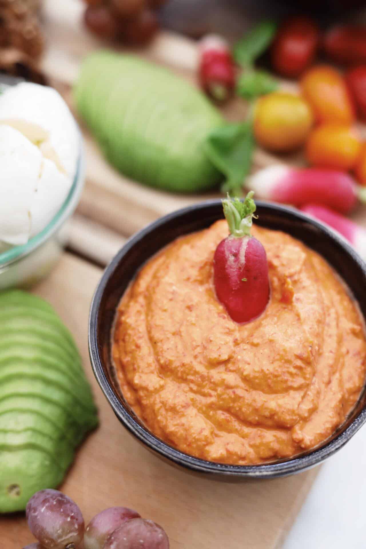Tapasbræt med lækkerier: Opskrift på humus med peberfrugt og cremede røræg