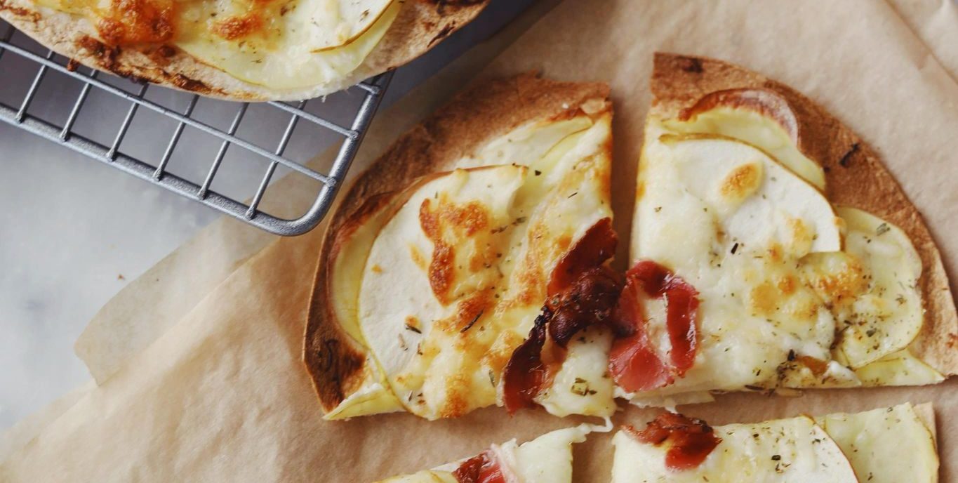 Tortilla pizzaer med kartoffel – opskrift på de lækreste tortilla pizzaer med flødeost, kartofler, æbler, revet ost og bacon. Det er så nemt at lave pizzaer ud af tortilla pandekager og det er en meget hurtig hverdagsret. Tortilla pandekagerne kan toppes med alverdens fyld, men her har jeg lavet dem til hvide kartoffelpizzaer med et touch af efterår i form af søde madæbler. Jeg har toppet hver pizza med et stykke bacon, men hvis du vil lave pizzaerene i en vegetarisk udgave, så kan du blot undlade bacon. Det er vigtigt at kartoflerne bliver skåret ud i meget tynde skiver, ellers når de ikke at blive møre, når de bliver bagt i ovnen. Jeg bruger et mandolinjern (f.eks. dette *reklamelink), men en skarp kniv kan også sagtens bruges. Pizzaerne skal helst serveres lige, når de kommer ud af ovnen, da de hurtigt bliver “bløde”. Server gerne pizzaerne med frisk salat til. Rigtig god fornøjelse!