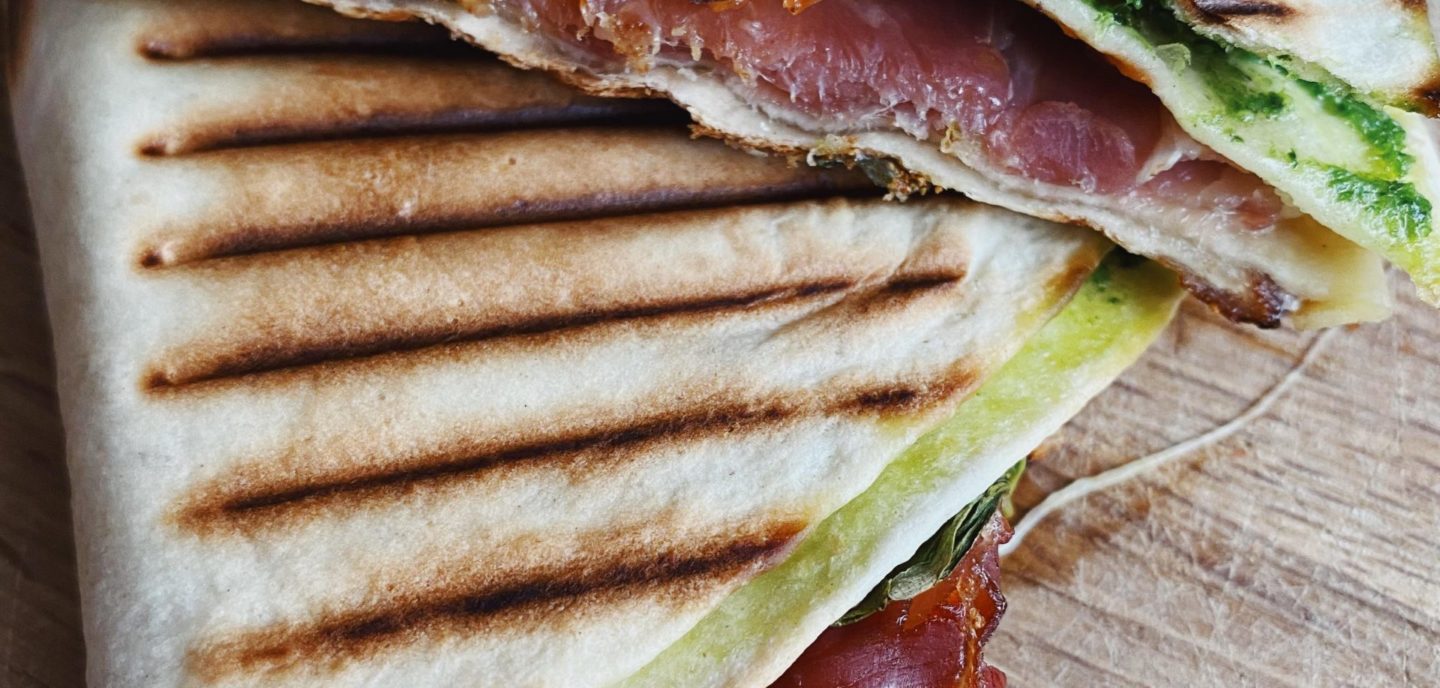 Tortilla wrap med pesto og parmaskinke – Opskrift på nem og lækker grillet tortilla wrap med pesto, parmaskinke, mozzarella og tomater. Wraps er super lækre og kan fyldes med alverdens lækkert fyld. Jeg har fyldt min wrap med det jeg lige havde i køleskabet, og det blev så lækkert.